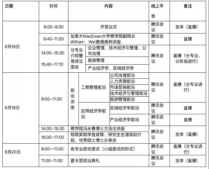 为进一步探索改革商学院学术人才的选拔与培养模式,天津财经大学商学院将于2020年8月18日至20日举办优秀本科生暑期线上夏令营,欢迎有志于就读天津财经大学商学院研究生的优秀学子报名参加交流活动(面对在校大三学生),本科专业不限于经管类专业,欢迎工科和理科学生入营。鉴于2020年全球范围内发生的“新冠疫情”尚未过去,2020年暑期夏令营拟以线上方式进行。 1 学校与学院简介 天津财经大学始建于1958年,是新中国最早建立的财经大学之一,是一所以工商管理和应用经济学科为主干,兼有文学、法学、理学、工学、教育七大学科门类交叉渗透、协调发展的多科性大学,现有"应用经济学"、"工商管理"、"管理科学与工程"等3个一级学科博士学位授权点、3个博士后科研流动站,覆盖21个二级学科博士学位授权点;拥有7个一级学科硕士学位授权点,覆盖46个二级学科硕士学位授权点和13个专业硕士学位授权点。 天津财经大学商学院渊源于南开大学经济管理类专业,历史可以追溯到学校1958年创建之初的商业经济系与工业管理专业,是我校最为悠久、底蕴厚实的学科之一。在近六十年的发展历程中,涌现出一批在国内外享有盛名的专家、学者,现拥有教育部“长江学者奖励计划”特聘教授、国家级教学名师、国务院政府特贴专家、国家级模范教师、教育部新世纪人才、天津市教学名师、天津市学科领军人才、天津市突出贡献专家等,入选天津市“131创新人才工程”18名。经过50 多年的发展与建设,商学院发展的水平在不断提升,学院的工商管理一级学科是天津市一流学科。 商学院于2005年获得工商管理一级学科博士学位授予权以及博士后流动站,现在企业管理、公司治理、技术经济与管理、产业经济学4个学科方向招收博士生;拥有企业管理、公司治理、技术经济及管理、旅游管理、产业经济学、区域经济学等7个学术学位硕士点,拥有旅游管理专业学位硕士点。 近5年来,商学院共承担纵向科研项目63项,其中国家级纵向研究课题20多项,教育部10多项。在国际国内优秀的学术期刊,如管理世界、中国管理科学、南开管理评论、中国工业经济等发表很多有影响力的研究成果,在国内外高水平期刊公开发表论文200多篇,出版专著30多部,获得天津市社会科学优秀成果一、二等奖多项。 学院拥有丰富的校友资源,其中不少是各级政府部门、企事业单位的负责人和业务骨干,为我院研究生的专业学习、能力提高、眼界开拓和职业发展起到重要的引领作用。 2 夏令营基本情况介绍 天津财经大学商学院线上夏令营为全国有志于经管研究和从事经管工作的优秀本科生提供短期学习和交流平台,夏令营特别欢迎优秀的工科和理科学生入营。夏令营以 “崇尚科学、求实创新、服务社会”的理念,以“创造、分享、合作”为主题,通过讲座、研讨等形式,为广大优秀学子提供开拓视野、展示风采的机会,也为崇尚学术、富于创新的本科生提供免试攻读企业管理、公司治理、技术经济与管理、产业经济学、区域经济学、旅游管理专业学术型硕士的机会。 3 2020年夏令营计划 (一)活动形式与内容 2020年夏令营活动包括励志讲座、专题研讨、研究前沿、综合测试等形式。 1.天财商学前沿在线讲座 2.远程师生交流专题互动 3.远程专业素养综合测试 4.在线优秀营员评选活动 (二)活动规模与时间 1.参营人数 本届夏令营根据商学院2021年研究生招生规模实际需要拟招收营员80人。 2.活动时间 (1)报名阶段 即日—7月15日:宣传、报名阶段; 7月16日—7月20日:资格审查、选拔; 7月25日,公布入围名单、下达通知。 (2)天津财经大学商学院2020年线上夏令营活动拟定于2020年8月18日至20日线上举行。