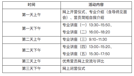 夏令营预期将于2020年8月11日左右开营,为期三天(具体时间等待通知)。