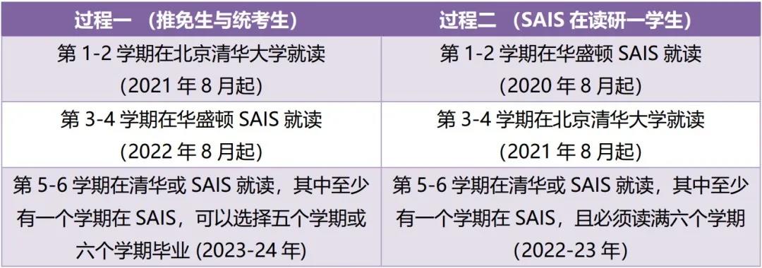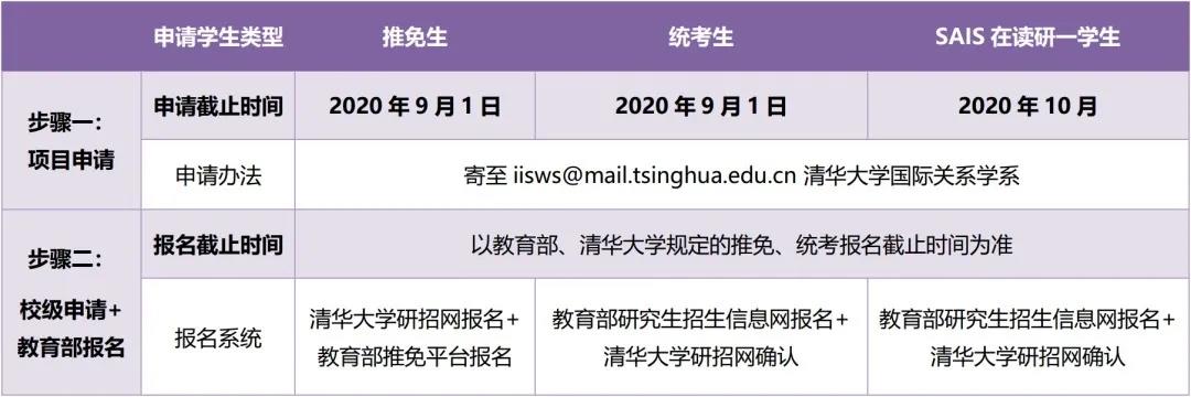 2020年8月起在SAIS就读的一年级硕士新生(国籍为中国大陆)也可以报名本项目,具体申请办法在9月由两校通过SAIS系统通知。申请人需同时根据全国研究生统考要求提交申请资料,在中国研究生招生信息网上报名(http://yz.chsi.com.cn)。报名后必须登录清华网上报名系统(http://yz.tsinghua.edu.cn)上传电子照片并通过照片审核。